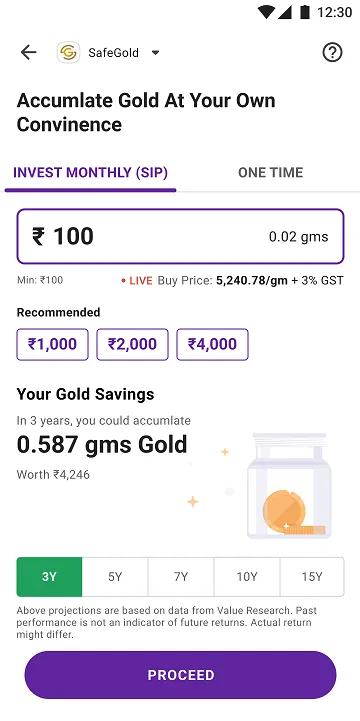 Through the Gold SIP, users can begin investing in the highest purity 24K Gold with as low as Rs 100 per month and continue to invest small amounts regularly to build their Gold savings gradually.
