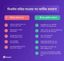 - ডিভাইস হারালে অবিলম্বে রিপোর্ট করুন: আপনার সিম কার্ড ব্লক করার জন্য আপনার টেলিকম সুবিধা প্রদানকারীর সঙ্গে যোগাযোগ করুন এবং সব অ্যাকাউন্ট স্থগিত করার জন্য ব্যাঙ্ক বা ওয়ালেটের সুবিধা প্রদানকারীকে জানান।