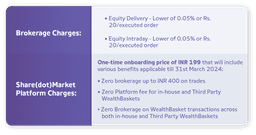 Share(dot)Market will provide a wide spectrum of investment products allowing investors across different demographics to build a well-rounded and balanced portfolio. Share(dot)Market offers stocks (intraday and delivery), Mutual Funds, Exchange-Traded Funds (ETFs), and WealthBaskets. WealthBaskets are curated collections of stocks/investment products by SEBI registered intermediaries that align with specific themes, sectors, or market trends enabling active equity portfolio building with great convenience, and at low costs.
